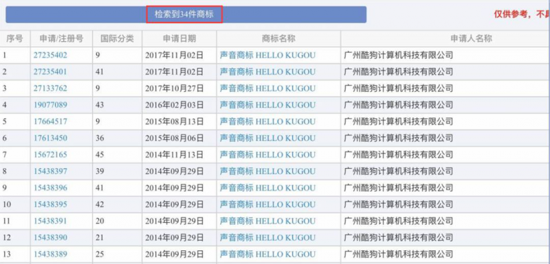 商标局官网数据显示,酷狗共申请了34件声音商标。