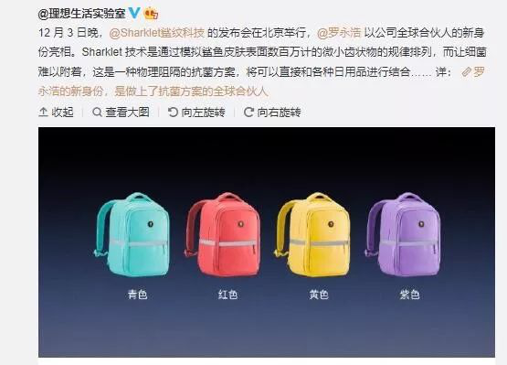 罗永浩表示,Sharklet技术可能是目前全球唯一一种通过纯物理微结构达到抗菌防污的技术,并现场展示了带有Sharklet抗菌材料的地平线8号抗菌儿童背包、铝镁商务旅行箱。
