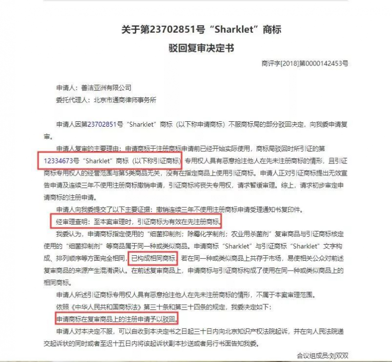 “善洁亚洲有限公司”不服商标局的驳回决定,向商标局提起驳回复审。原商标评审委员会于2018年8月作出决定,除了对一件第44类“Sharklet”商标予以初步审定外,对其他的四件第5类、第42类“Sharklet”商标注册申请仍然予以驳回。